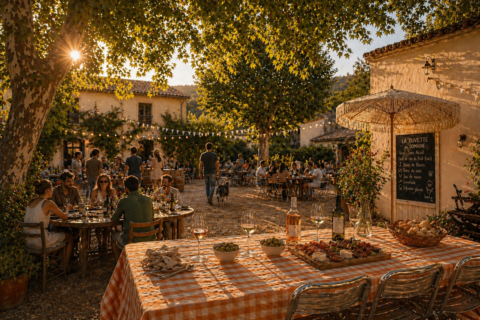 Extérieurs, salle d’activité, espace convivial, petit-déjeuner, planches apéritives, buvette et ambiance simple pour profiter du lieu sans complication.
